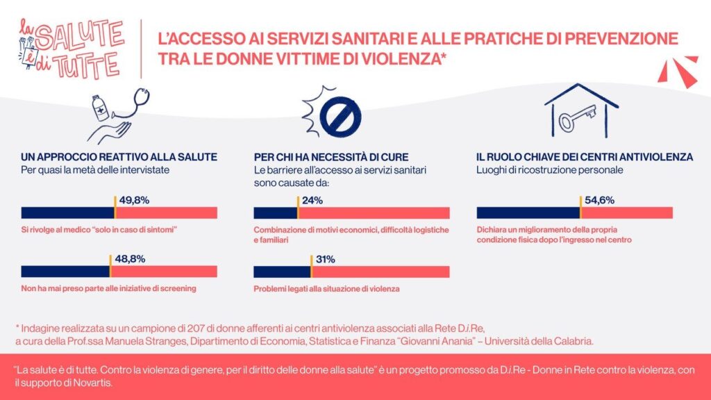 La violenza nega il diritto alla salute delle donne, ma la salute è, per le donne, al centro della rinascita dalla violenza, come possibilità di sentirsi di “riconoscersi degne”, di “iniziare una nuova vita”. Per rispondere a questo bisogno nasce il progetto “La salute è di tutte. Contro la violenza di genere, per il diritto delle donne alla salute”, realizzato da D.i.Re – Donne in Rete contro la violenza, con il supporto di Novartis, azienda leader nell’innovazione in ambito farmaceutico, impegnata al fianco di tutti gli attori del sistema Paese per reimmaginare la salute del futuro, in ottica di equità e tempestività di accesso all’innovazione; un impegno che va di pari passo a quello per la parità di genere. Il progetto ha ricevuto il Patrocinio della Società Italiana di Cardiologia (SIC). I risultati dell’indagine[1] che ha coinvolto 207 donne nei centri antiviolenza della rete D.i.Re in tutta Italia, mostrano gli ostacoli che la violenza crea nell’accesso delle donne alla prevenzione e ai percorsi di presa in carico. Quasi la metà delle donne intervistate (48,8%) non ha mai preso parte alle iniziative di screening promosse sul territorio e il 31% di coloro che ha bisogno di cure incontra barriere nell’accesso ai servizi sanitari a causa della violenza.